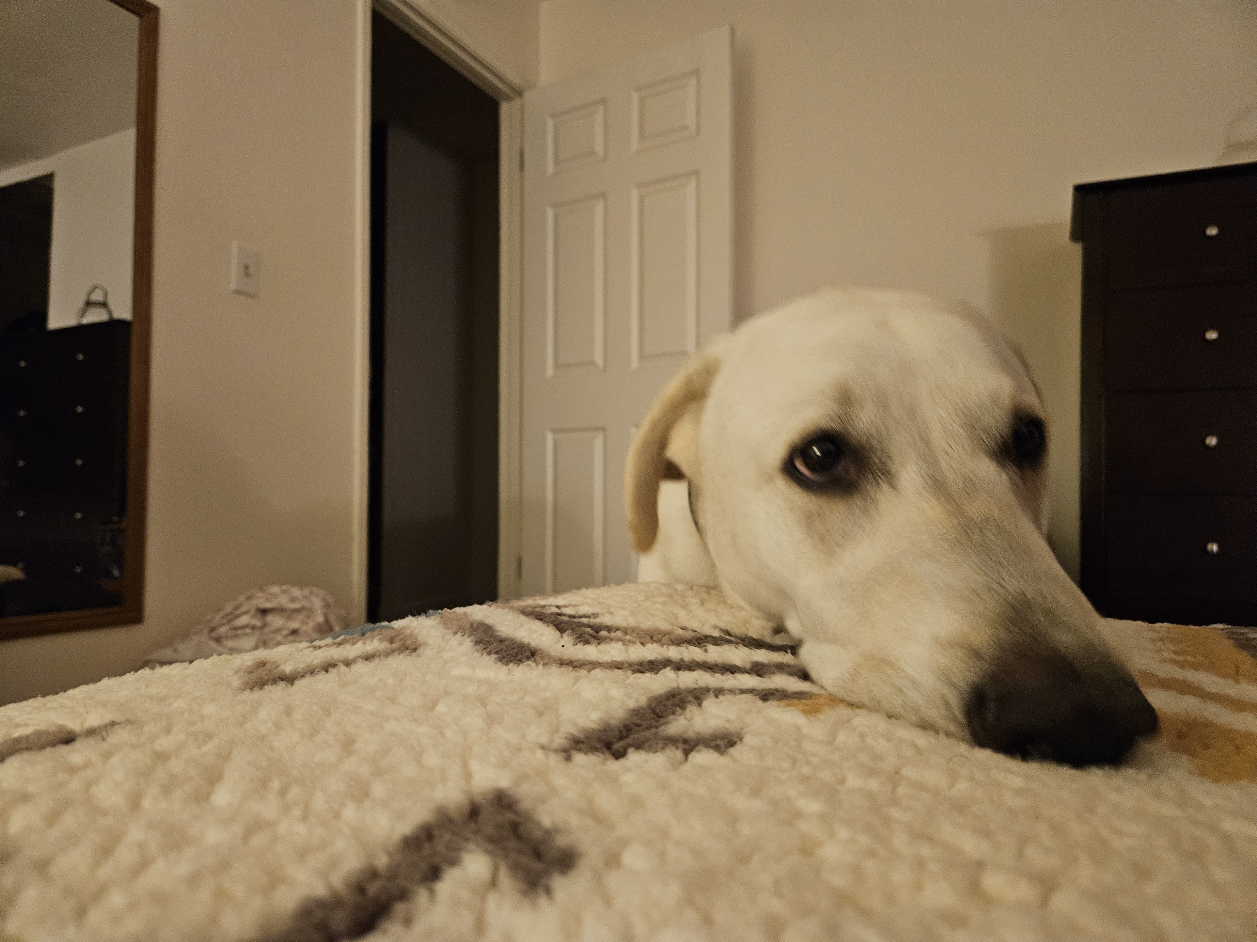 This is his way of saying “Your permission to join Mom and Dad on the bed hasn’t come yet. Waiting on you guys.”